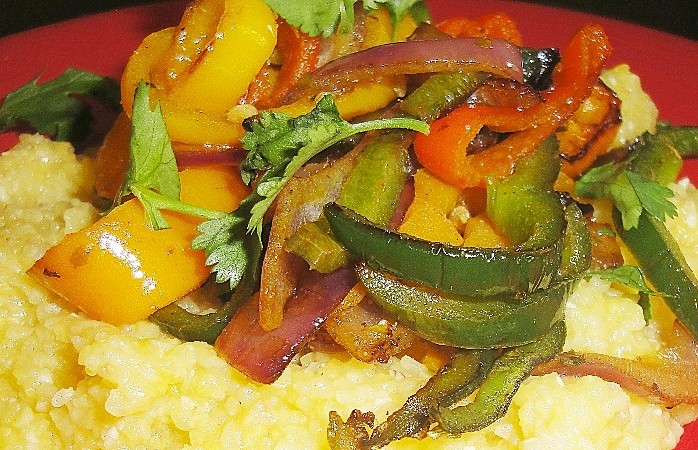Long before it became fashionable, I was a fan of grits. Some people find them boring. To me, they’re homey comfort food and have a use far beyond adorning a platter of bacon and eggs. Grits are also called polenta in Italian, which has a nicer ring to it. I serve polenta instead of potatoes, rice, or noodles, nestling it under chicken cacciatore, chicken fricassee, gravy, ossu bucco. Polenta makes a great bed for Peperonata (see photo at right), and so on.